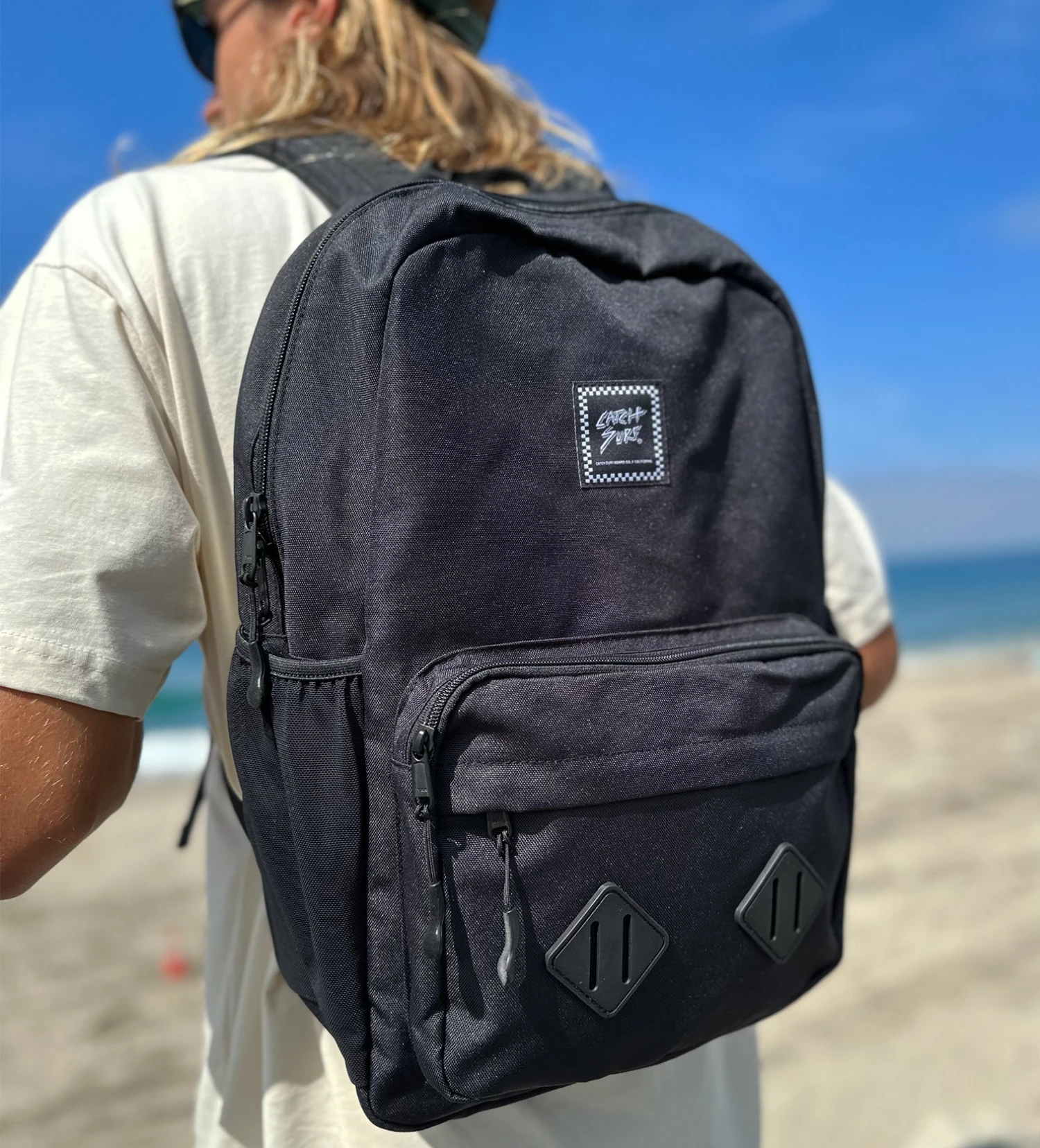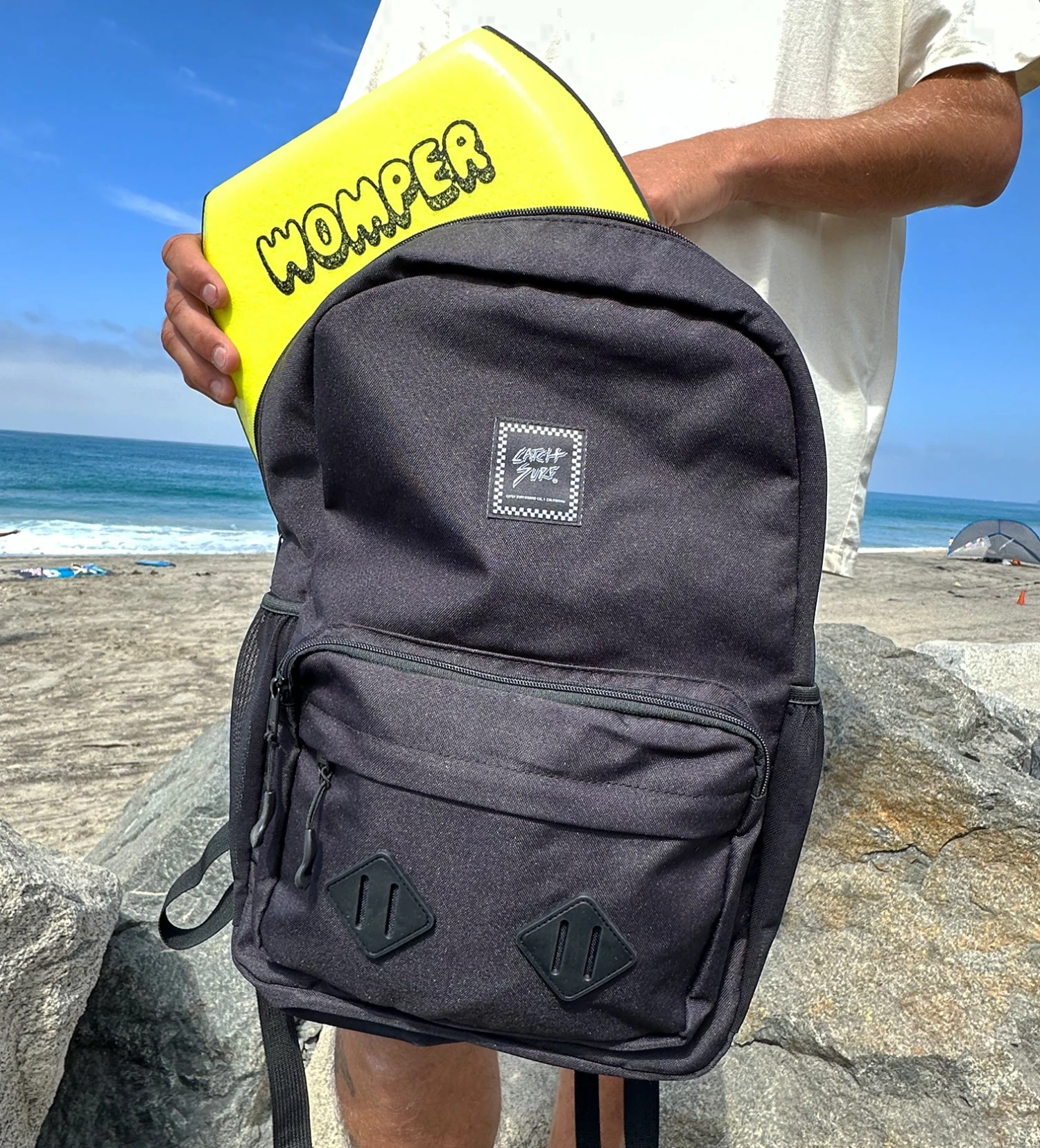Our all-new and rider-tested backpack was designed to be used not only for beach day duties but for school adventures, travel and everything in between. Design focus was on durability and functionality in a light-weight and compact design. Fits a Womper and beach towel in main pocket and can hang your swim fins from the outside front loops. Has padded back and inside laptop/tablet pocket. Front pocket has large pouch for surf wax, pencils, phone, chargers, etc. and a smaller pocket for other easy-to-access items. Super-comfy adjustable shoulder straps secure the pack with maximum comfort. Made of durable 600D recycled ripstop P/U fabric with water-repellant finish. And premium YKK zippers seal the deal!